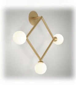 L’applique murale Rhombus éditée par la maison Atelier Areti appartient à une collection de luminaires design géométriques graphiques, simples et magnétiques. Après les lampes murales Circle et Triangle (en vente chez BLOU) la marque s’attaque au losange, au rhombus schématique délivré de tout artifice. Seules 3 boules de verre opalin viennent rehausser la structure-armature de l’ensemble fabriqué en laiton brossé. Luminaire esquisse, lampe épurée, l’applique murale Rhombus Areti vibre malgré sa simplicité. La noblesse du laiton, l’opalescence des ampoules en verre soufflé, tout est délicat et parfaitement à sa place dans ce luminaire mural design fabriqué à la demande en Allemagne par des artisans talentueux et inspirés. La sobriété de sa ligne permettra à la lampe Rhombus wall light de s’intégrer dans une grande variété de décors (du plus classique au plus contemporain). Elégante et minimaliste l’applique Losange Areti se plie en 4 pour fournir un éclairage d’ambiance optimal. Les passionnés de décoration et amateurs de design éclairés choisiront de l’utiliser seule ou en duo voire accompagnée d’autres figures géométriques. Idéale sur les murs d’une entrée, d’une salle à manger, d’un bureau ou d’une chambre à coucher, l’applique Rhombus Areti qui se décline en plusieurs versions (voir ci-dessous) procure un éclairage omnidirectionnel doux et chaleureux, idéal pour une ambiance feutrée.