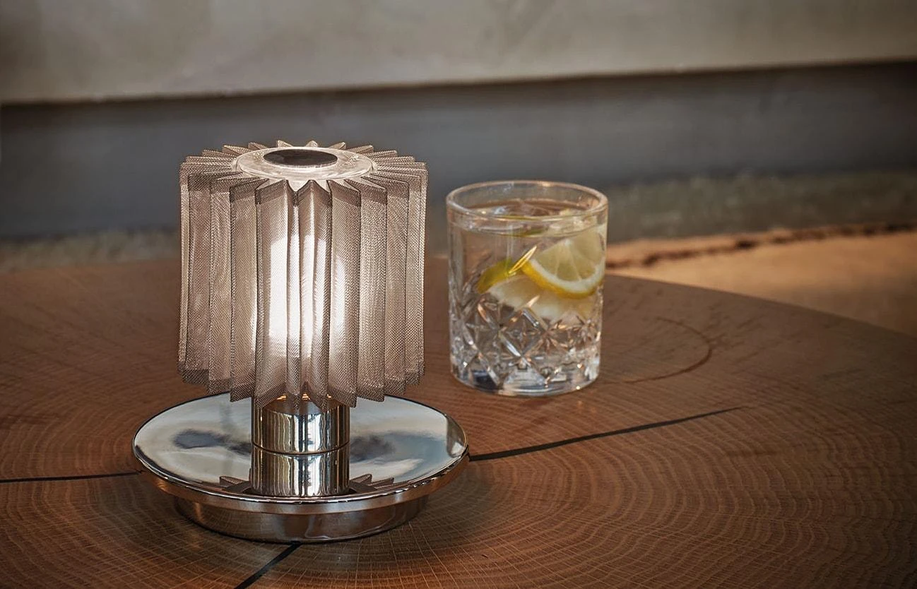 La lampe In the Sun table éditée par la marque DCW est un hommage à un personnage majeur de l’histoire de France : Louis XIV, le roi soleil. A l’image de toute la collection In the Sun (appliques et suspensions en vente chez BLOU) la lampe nomade imaginée par Dominique Perrault et Gaëlle Lauriot-Prévost dans le cadre de la réhabilitation et de la restauration du Pavillon Dufour au Château de Versailles crée une atmosphère unique, à la fois rayonnante et intime. A la manière d’un bougeoir que l’on baladerait de pièce en pièce, de guéridon en console, la In the Sun table DCW éditions se déplace au gré des besoins et des envies et dessine une douce lumière, subtile et joyeuse. Totalement autonome (comme la lampe Boucle DCW en vente chez BLOU), la lampe de table In the Sun s’affranchit de toute contrainte technique grâce à sa batterie rechargeable, dispensant ce luminaire design d’un câble d’alimentation qui en ternirait la silhouette noble et racée. Les 5 positions de l’interrupteur offrent autant de possibilités de créer une ambiance lumineuse sur mesure en jouant sur l’intensité du halo. Extrêmement délicate et élégante, la lampe nomade DCW composée d’un abat-jour en maille plissée (de couleur argentée ou dorée selon la finition choisie) et d’un corps en laiton ou en acier, joue avec les propriétés réflectives des matériaux et esquisse des zones d’ombres et de lumières. La lampe design nomade In the Sun qui a su brillamment associer élégance classique et fonctionnalité grâce à de judicieux choix techniques (batterie et variateur d’intensité) possède tous les atouts pour devenir une référence en matière d’éclairage. Dîners en tête à tête ou conversations animées, ambiance reposante ou joyeuse, intime ou conviviale, la lampe de table In the Sun mystérieuse et solaire sera de tous les instants, les rendant inoubliables et uniques. La lampe de table In the Sun, vagabonde et radieuse, trouvera sa place dans une salle à manger ou un salon, un fumoir chic ou un bar d’hôtel haut de gamme. Mobile elle sait s’adapter aux lieux et aux décors. Seule sa présence majestueuse ne change jamais. Peu importe la décoration toute l’attention pourrait graviter autour de la lampe de table design In the Sun. Comme le Roi Soleil.