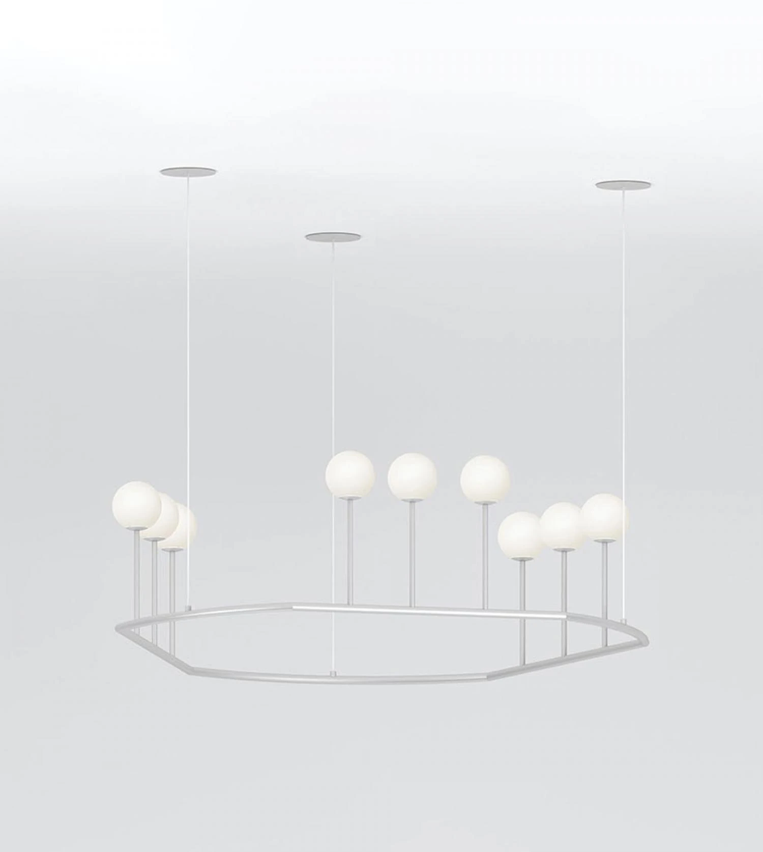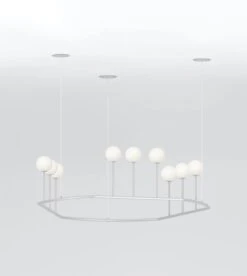 La monumentale suspension Standing Globes Up éditée par Atelier Areti est aussi fascinante qu’ambitieuse. Avec ses 9 globes de verre opalin répartis en trios cette pendant light hors norme se charge de l’ambiance et du spectacle. Grâce à son câble adaptable la suspension Standing Globes Up Areti prendra plus ou moins de hauteur en fonction de l’effet visuel souhaité. D’inspiration résolument contemporaine ce luminaire design grand format aux allures de mobile séduira les amateurs de décoration à la recherche d’une pièce unique qui bouscule les codes et enchante le quotidien. Disponible en laiton brossé ou en nickel, la Suspension Standing Globes Up imaginée par la maison Areti est un modèle d’élégance et de raffinement. En quelques traits Areti esquisse des luminaires magnétiques et solaires aussi atypiques que fonctionnels. En choisissant de placer chacune des sphères au bout de bras tubulaires placés le long du corps de la lampe et dressés vers le haut (contrairement à la lampe Standing Globes Down – en vente chez BLOU) Atelier Areti donne une dimension architecturale à sa pendant light qui occupe et habille l’espace sans jamais l’occulter. Luminaire design d’envergure destiné à illuminer les pièces capables de mettre en valeur ses généreuses mensurations (halls, entrées, salons, lieux d’exposition, hôtellerie de luxe, etc.), la Suspension Standing Globes Up Atelier Areti possède un style intemporel et sobre lui permettant d’intégrer un décor classique un peu trop sage ou de souligner une ambiance tendance préexistante. Fondée en 2008 la maison Atelier Areti a su séduire les passionnés de design et de décoration du monde entier par ses pièces lumineuses artisanales exceptionnelles et sa créativité sans borne. Atelier Areti aime bousculer les codes sans en avoir l’air et faire naître l’inattendu et le merveilleux au quotidien. Avec sa suspension design Standing Globes Up, véritable forêt lumineuse, Areti mériterait bien une standing ovation.